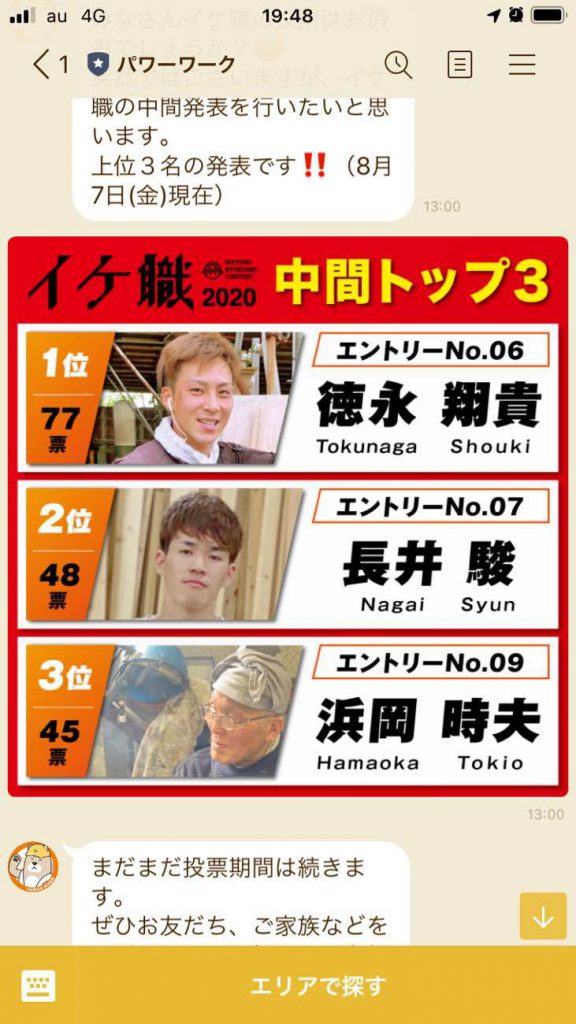 「イケてる職人さんコンテスト」というlineの人気投票に参加しているようです。