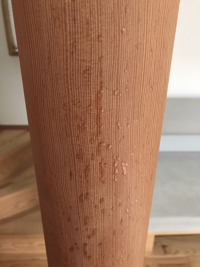 この丸柱、色味が気に入って米松(ベイマツ)という樹種を使ったのですが、松なので、脂(ヤニ)が出てきます。