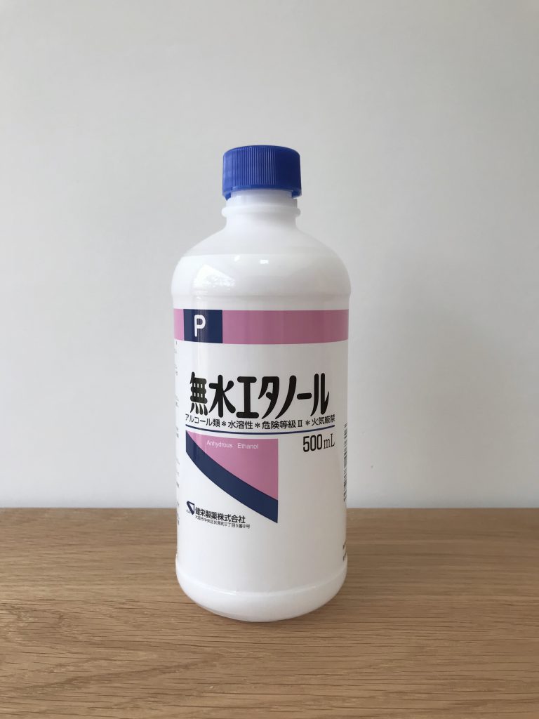 ※無水エタノールの原液を素手で触ると手が荒れてしまうことがあるようなので、ゴム手袋などの着用をおすすめします。