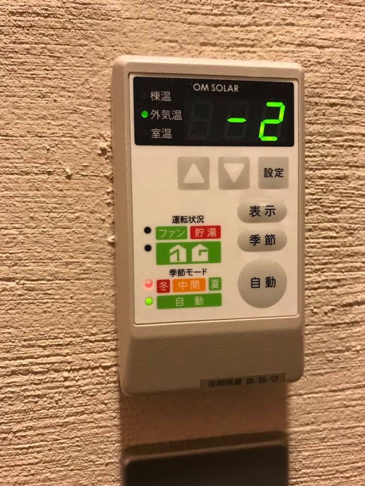 これは12/16水曜日の朝、自宅で撮ったOMソーラーの操作パネルの写真。