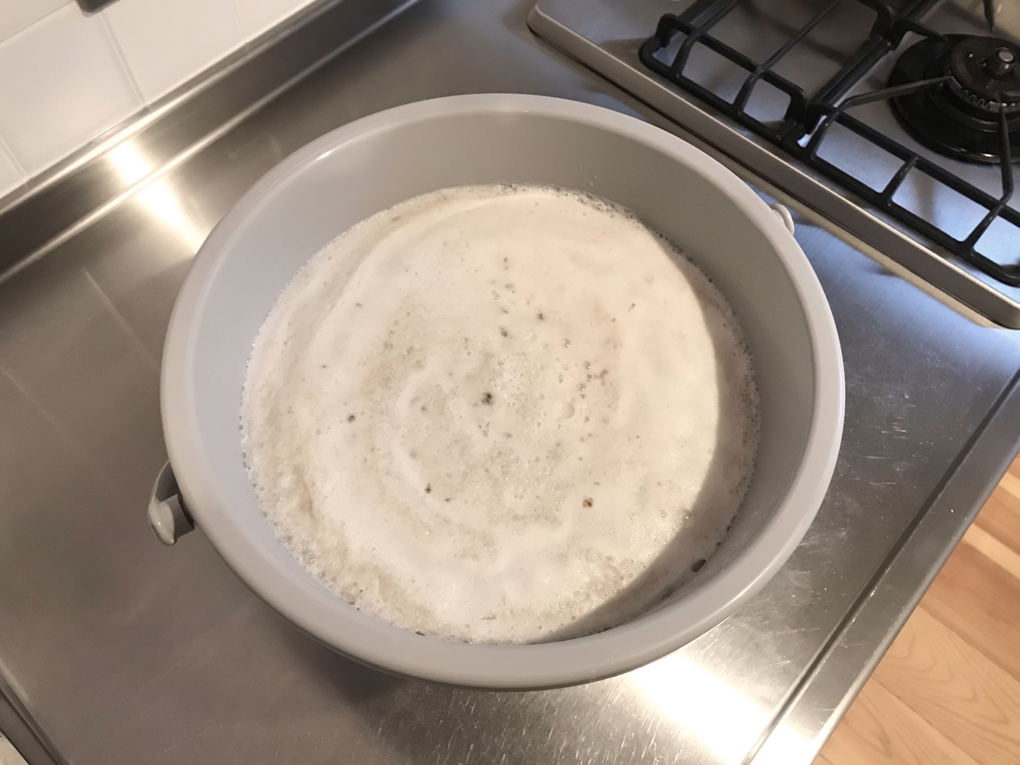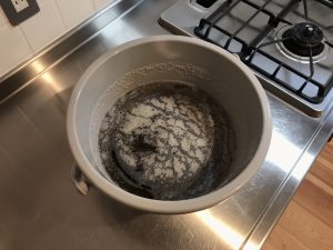 重曹を入れ過ぎたせいか、白い泡がモコモコしていますが、すぐに汚れが浮かんできました。