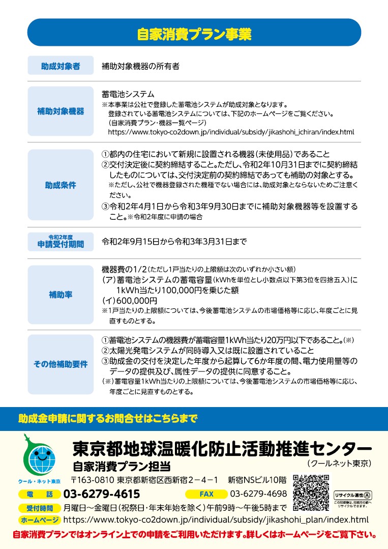 東京都では、蓄電池への助成金がありますが、