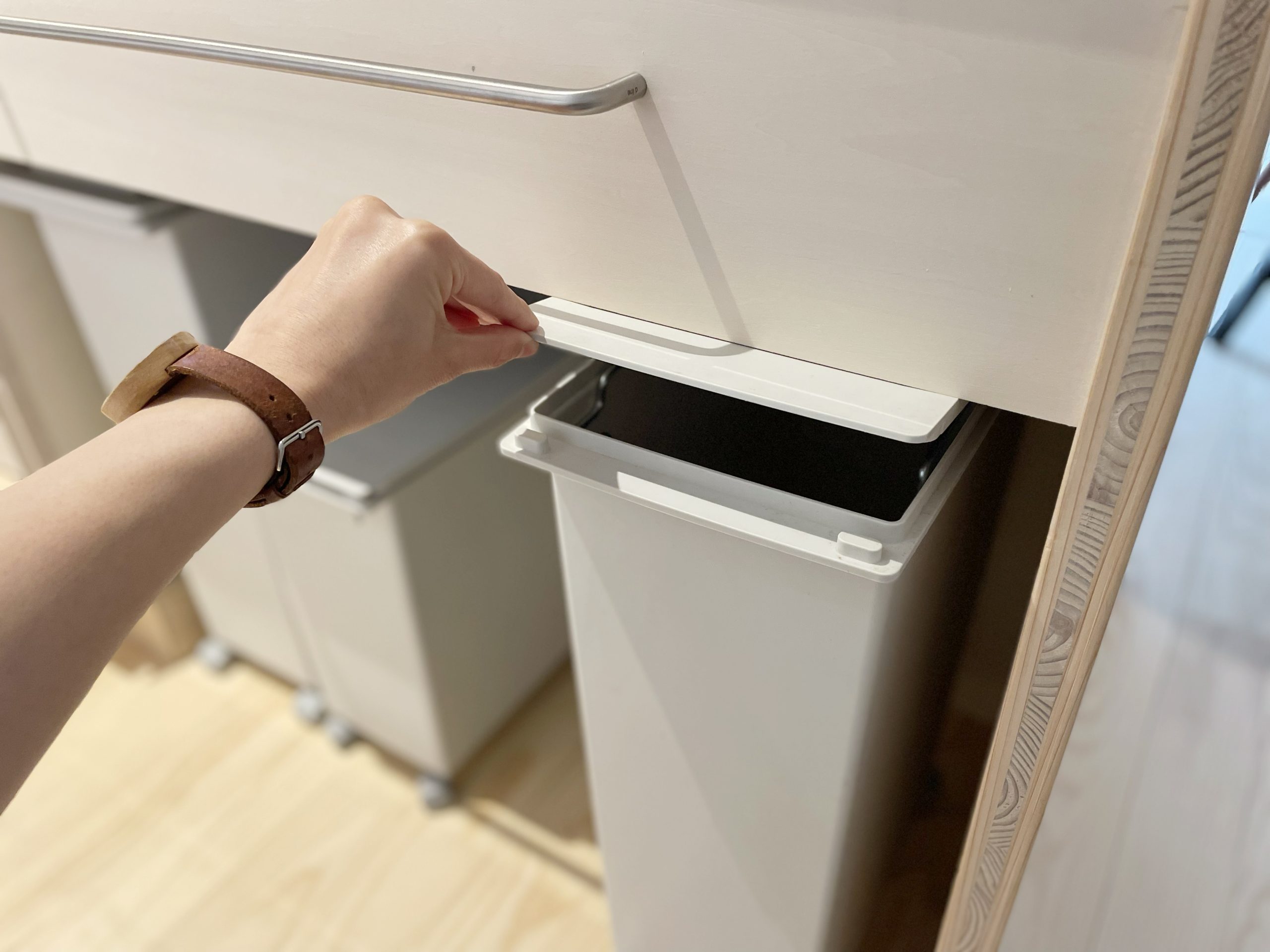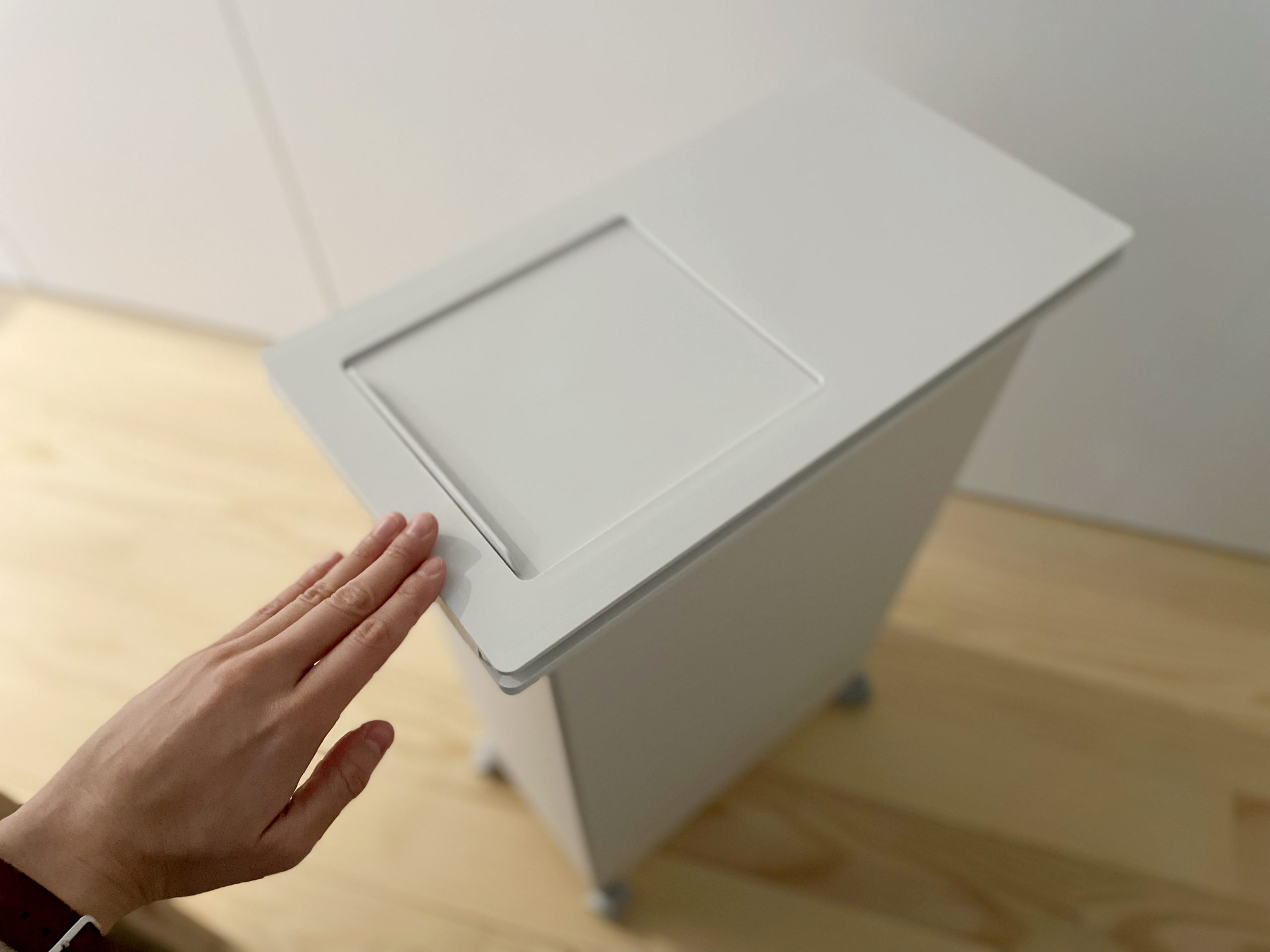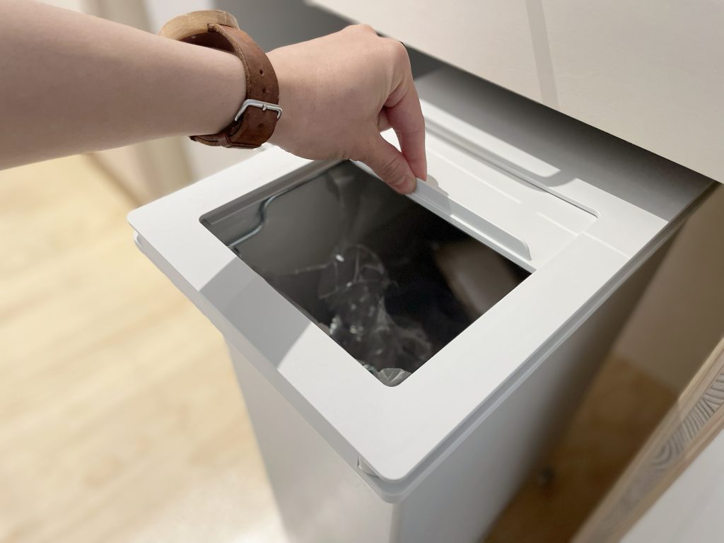 スライド部分は指一本で押せば開くくらい、とても軽くて滑らかでした。普段はスライド部分を開けっぱなしにして、ちょこっとゴミ箱を引き出すだけですぐにゴミが捨てられる!