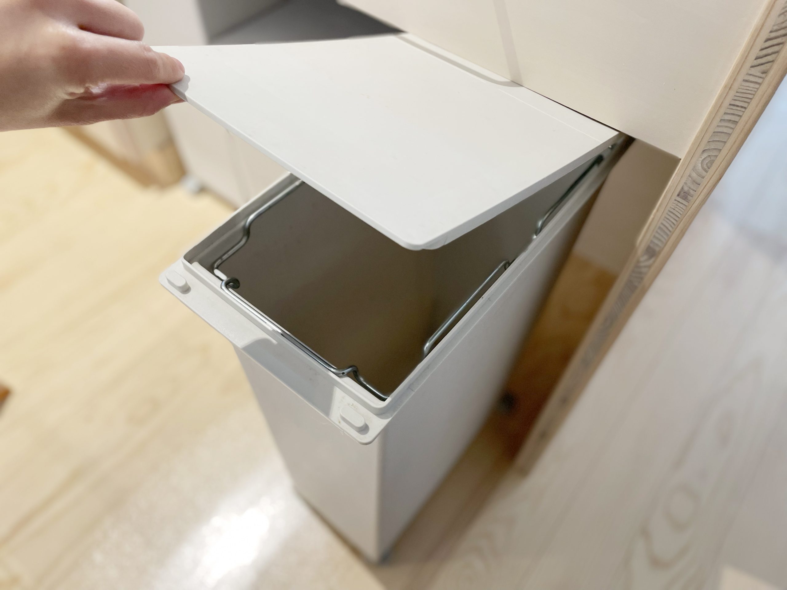 ただ、サイズがぴったりすぎてフタを開ける際に上にある木部にぶつかってしまうため、ある程度手前に引っ張り出してからフタを開けてゴミを捨てていました。