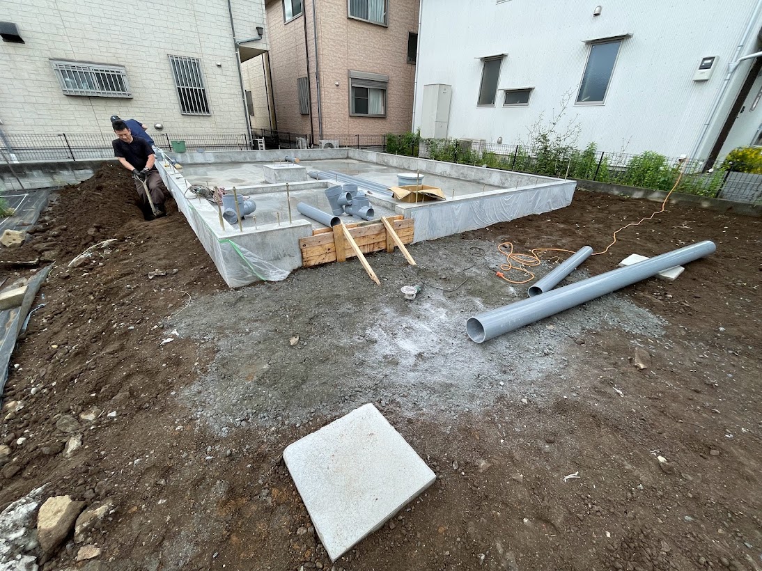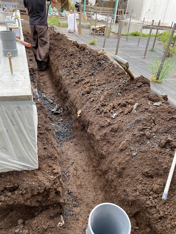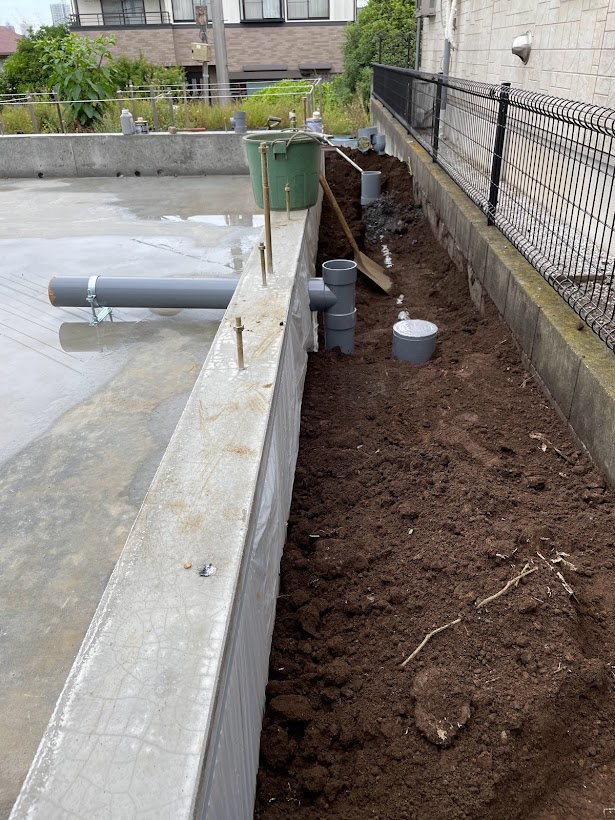 まずは、基礎の枠が取れたので給排水の配管工事を行いました。