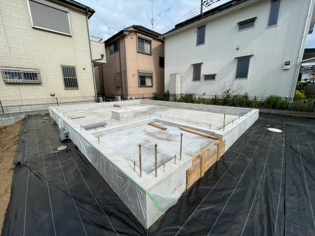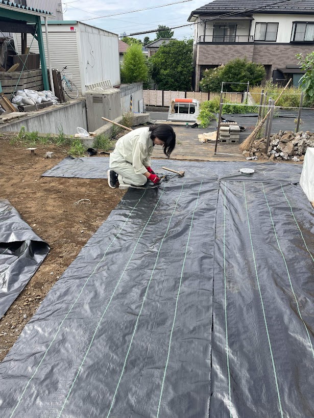 ▲配管後、基礎の周りに防草シートを張ります。