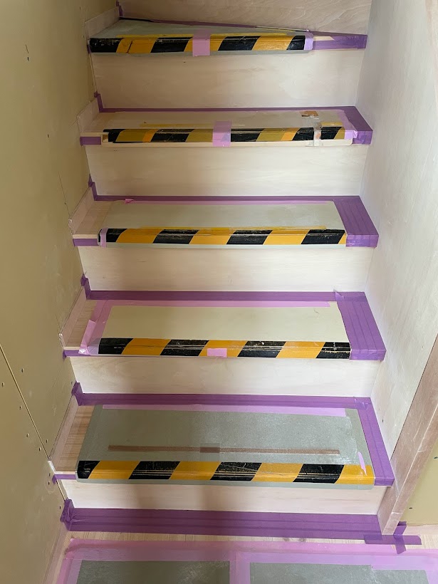 階段の踏面(上る際に足をのせる部分)とその他の部分とで使用する塗料が異なるため、丁寧にテープで養生されています。