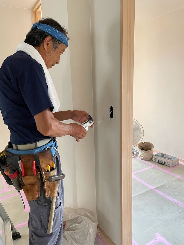 クロス工事完了後に、電気屋さんにコンセントなどの器具をつけてもらいます。