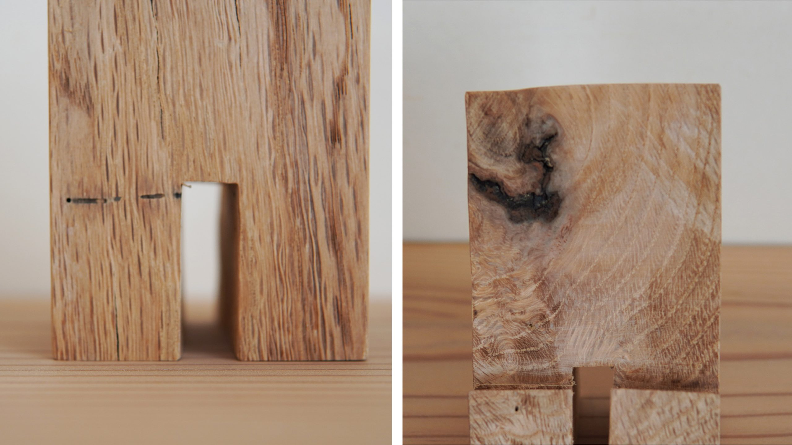 かなり個性的な材なので個体差が大きく、木目の強さやフシの具合など、好みのものをお選びいただけます。通常相羽建設で取り扱いのあるスマホスタンドに比べると、なんとなく民芸感というか、クラフト感があり可愛らしいのも特徴です。