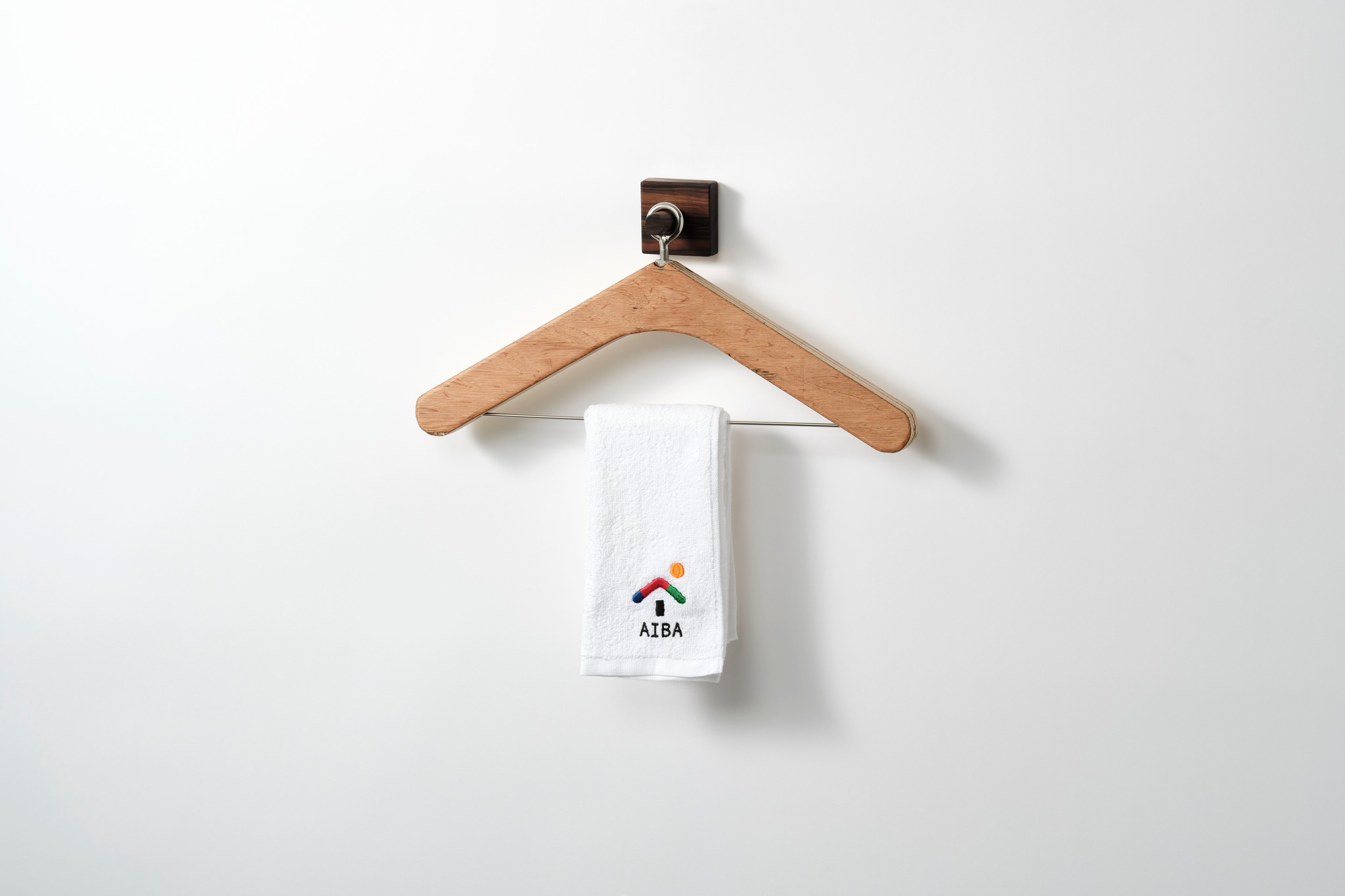 合板を有機的なかたちで削り出し、金物も使用して製作。フックの受けになる部分は黒檀からつくっていて木の色合いにコントラストがあります。作品を見た渡邉さんが「このタオルをかけると良い」とアドバイスしたAIBAタオルが聴いてますね!と小泉さん。
