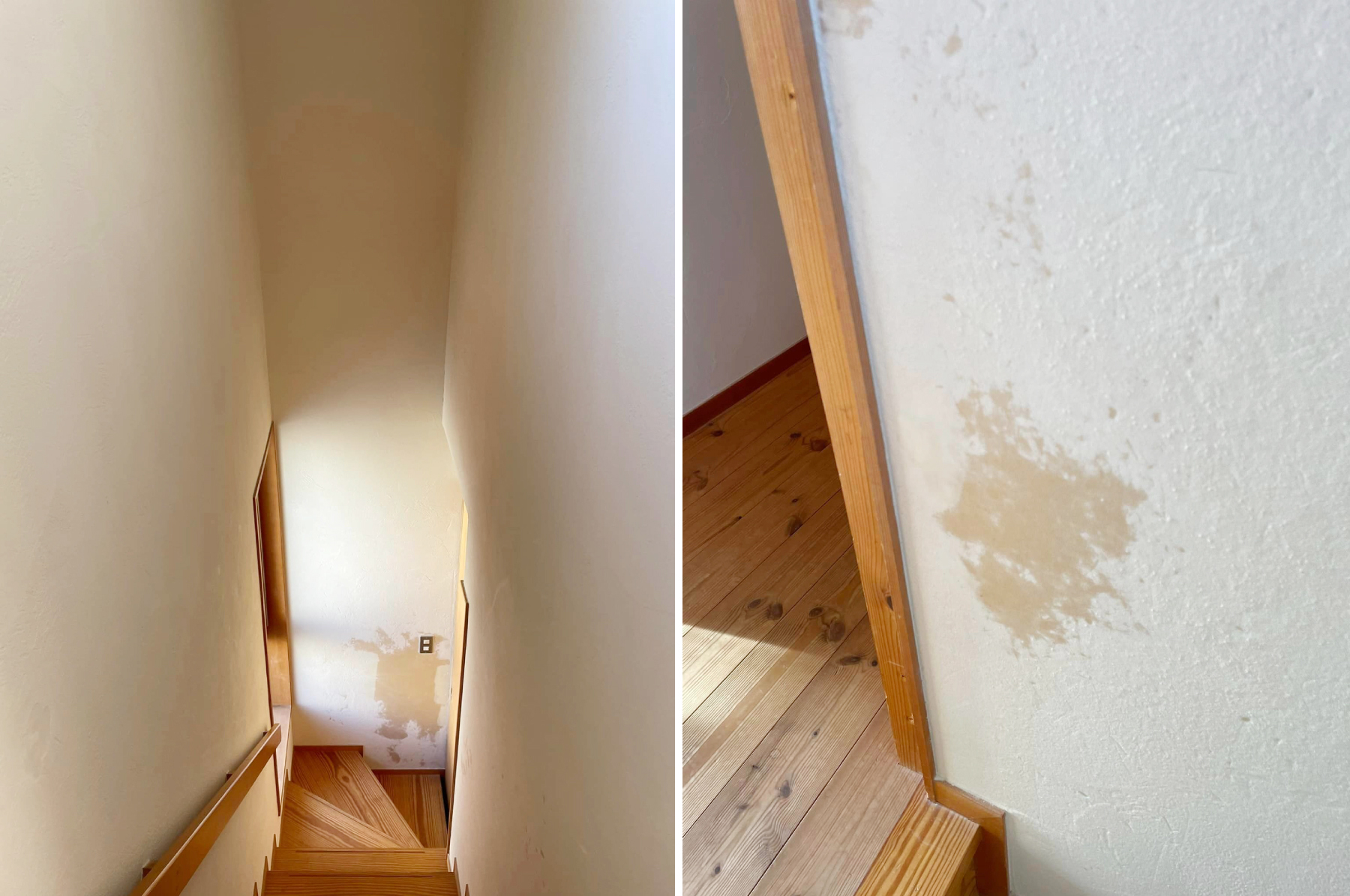 左)ボードを剥がして、階段頭上に2階から使用出来る押入れを作ります。どうやって作るか、色々と考えてみたいと思います。/右)壁材が剥がれています。経年変化を見ると色々と参考になります。頻繁に触る場所だったのでしょうか。