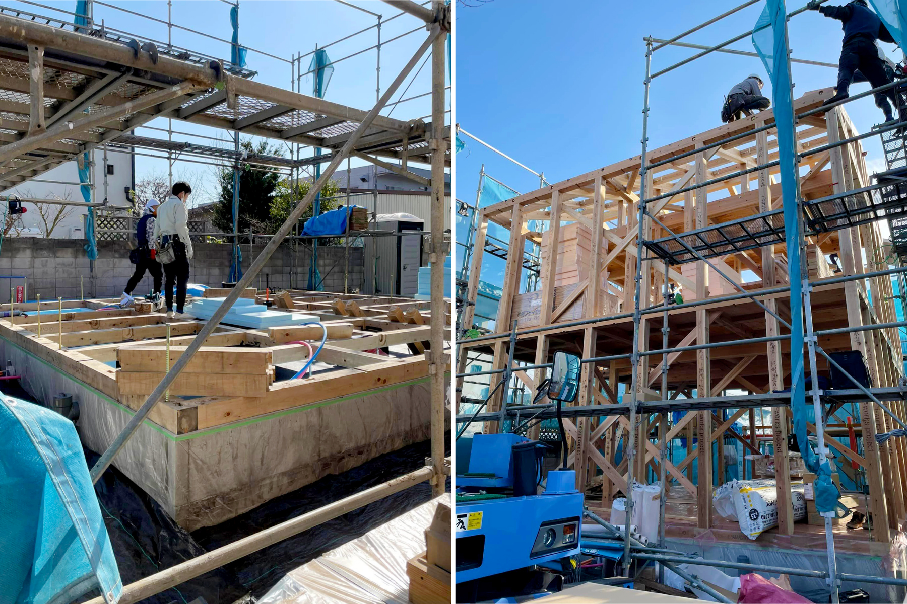 今週は、社員大工の優太さんと上小園さんが30日から土台を敷き、1日に上棟建て方を行いました。