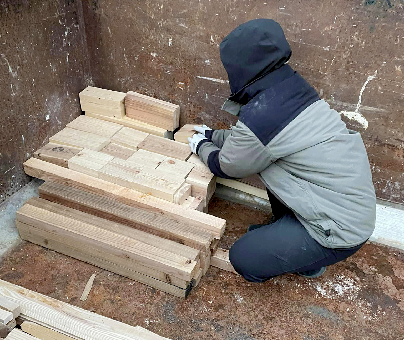 この日加工場では、現場監督の麻生さんが加工場コンテナ内の木材をテトリスのように整理して、沢山積めるようにキレイしてくれていました。