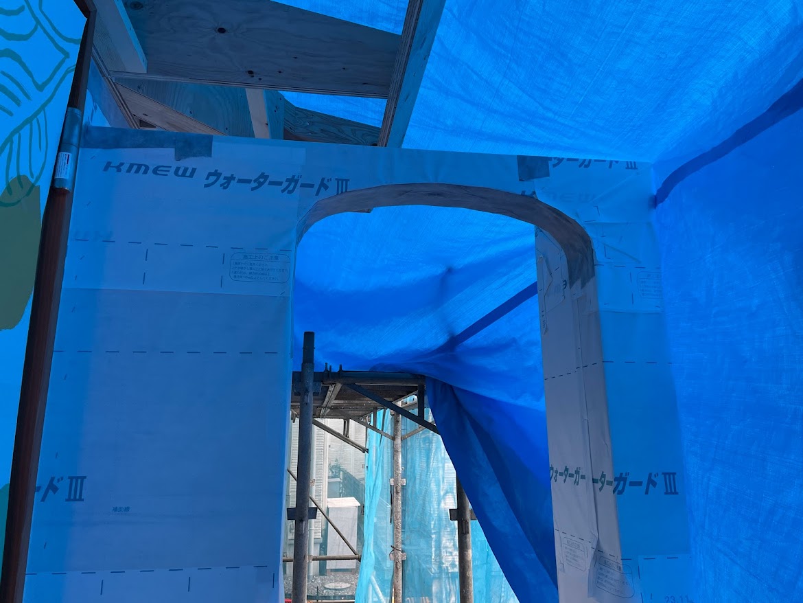2号棟は、外部の庇や袖壁の工事が完了し、外観の雰囲気が形作られてきた状態です。