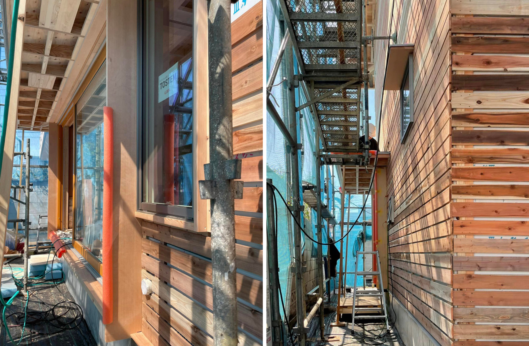 来週から左官工事が始まるため、社員大工の優太さん、薫さん、上小園さんがラス下、外部の窓枠の取り付け、庇の施工を行い、板金屋の田沼さんが屋根、庇の板金の施工を行いました。
