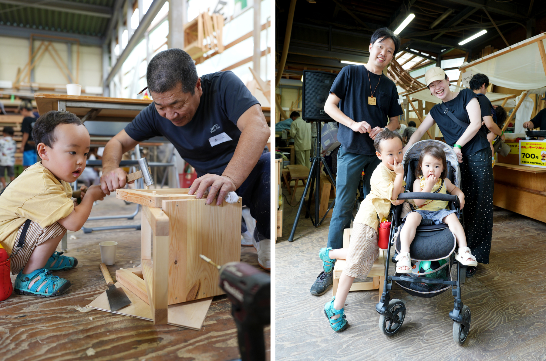 いつも相羽建設の家づくりを担当いただいている阿部大工と、弊社スタッフ松本夫妻の息子くんが一緒につくっている様子。食べ物屋台や、小さなお子様でも当日参加可能な簡単なワークショップもいろいろあるので1日楽しめます♪