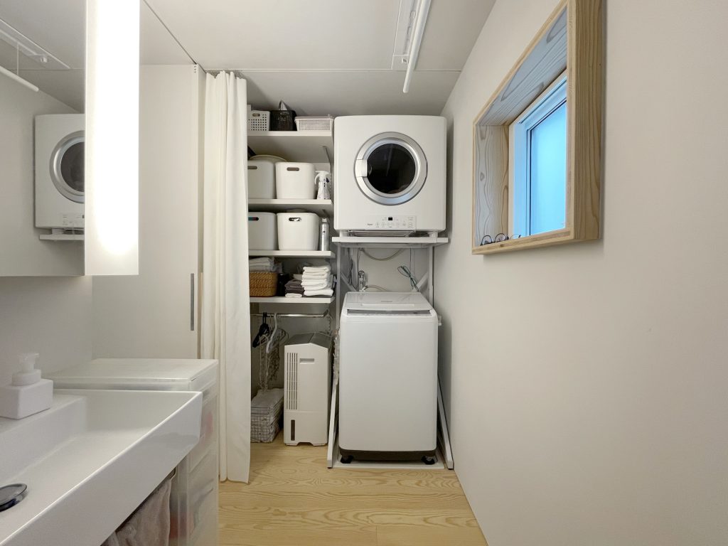洗面室は2.5帖ほどの広さのため、家族3人そろうとぎゅうぎゅうになりますが(笑)、コンパクトな空間の分、洗濯物が早く乾くので助かっています。