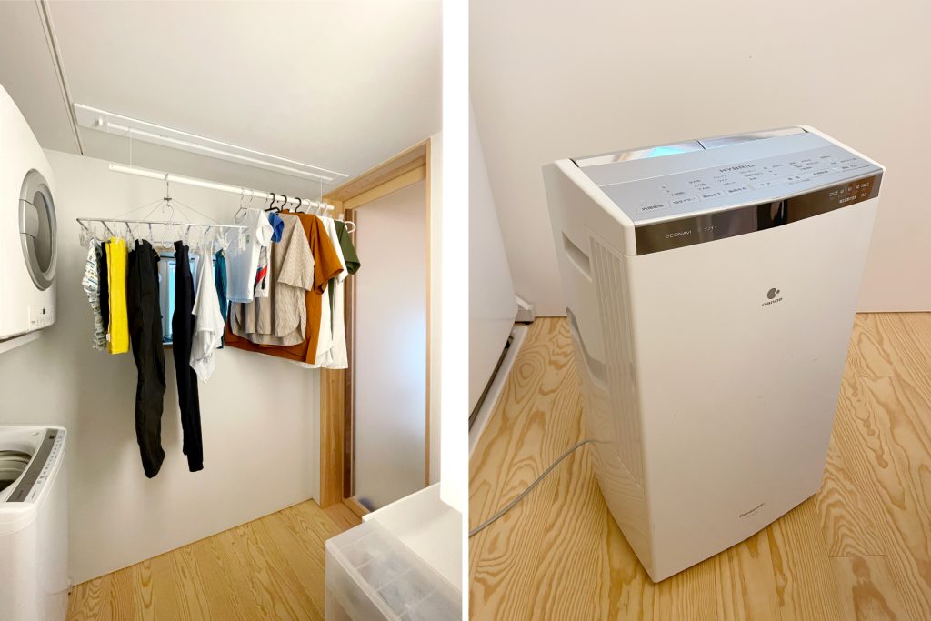 さらに、以前の家で室内干し用に使っていた衣類乾燥除湿機の効果も最大限に活用したかったので、洗面室が密室になるように通路との間に扉を設け、早く乾かせるように考えました。