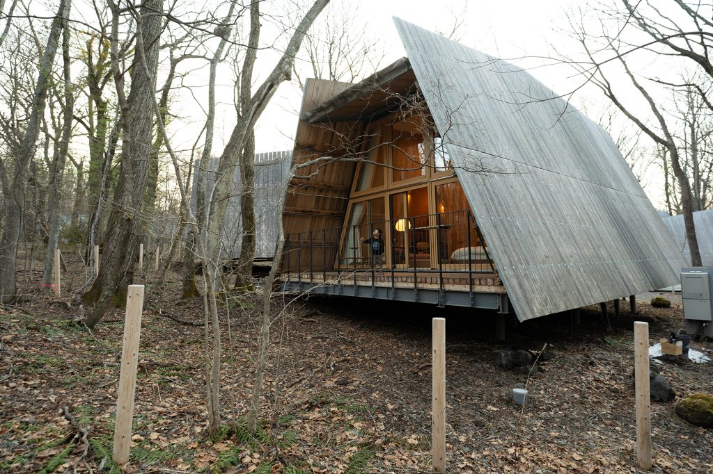 国産材の木材を活用し、地面に基礎をつくらずに建築をするスタイルで自然環境に負荷をかけず、数年後の移築・再活用も視野に入れた建物の在り方はとても新鮮。屋根材も木材の板を使用しています。