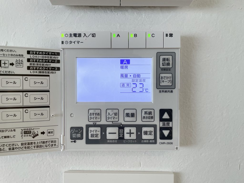下の画像はパッシブエアコンの温度設定モニター。A(1階床下)・B(1階居室)・C(2階居室)の3系統で個別に温度設定ができます。