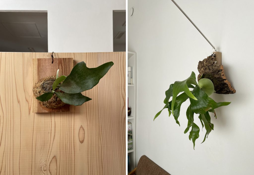左)社員大工の本多さんがいとう家にプレゼントしてくれたビカクシダ 右)つむじ文化祭で「植と酒」さんから奥様が購入したビカクシダ https://www.instagram.com/shoku_to__sake/