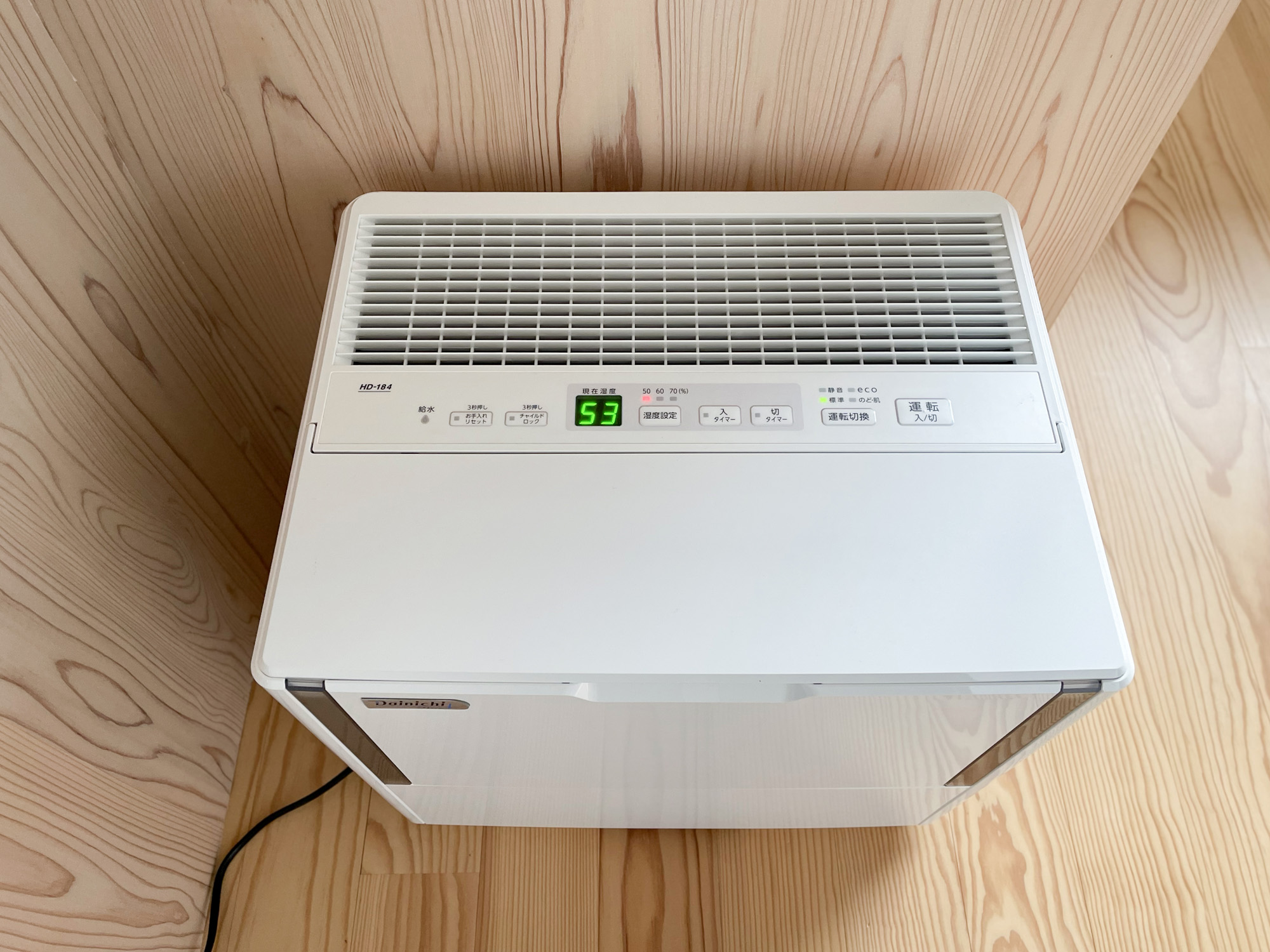 プレハブ洋室50畳・木造和室30畳までを対象とした製品で、加湿量は1,800ml/hのタイプです。いとう家のものは「HD-184」という型が少し古いタイプで、最新型はこちら(▶︎https://www.dainichi-net.co.jp/products/humidifier/lineup/pn2023/)。