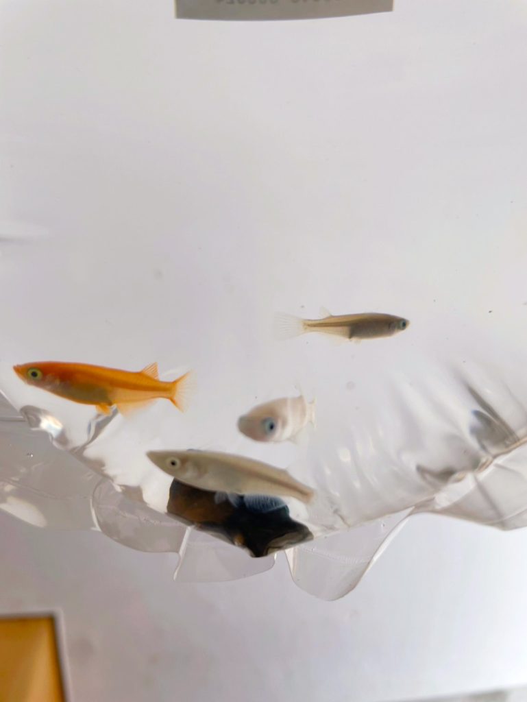 ビオトープでの初めての生き物は、初心者におすすめという、黒メダカ、白メダカ、青メダカ、楊貴妃メダカを1匹ずつと、ヒメタニシ1匹、そしてアヌビスナナという水草を入れてスタートしました。