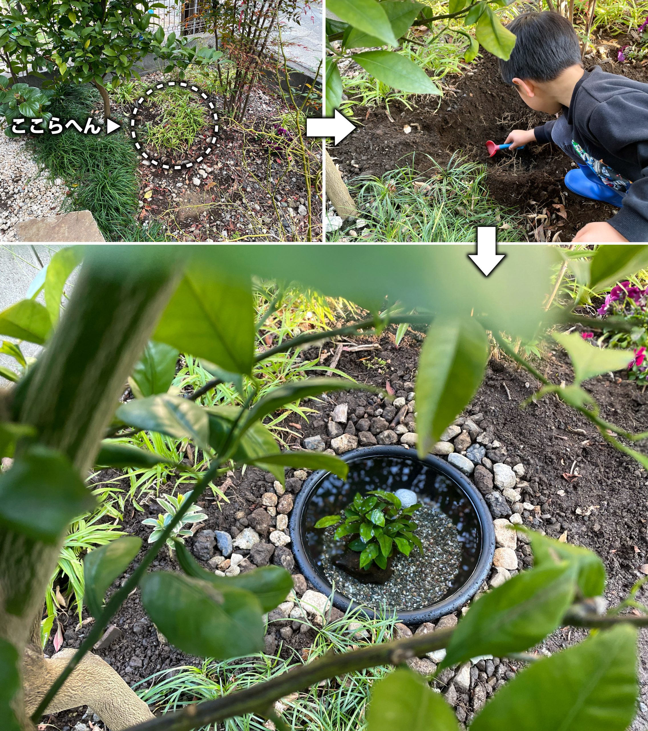 デザインとしては、小林賢二さんに造園いただいたお庭の雰囲気を大事にしたかったので、湿地帯のような本格的なビオトープにするのはバランス的に難しく、そもそもスペースが限られている。石鉢を置くのは合いそうだけれど、地面から高さがあると他の生き物が行き来しずらい…など、いろいろ考えた結果「水鉢を埋めて小さな池にしよう!」と決めました。