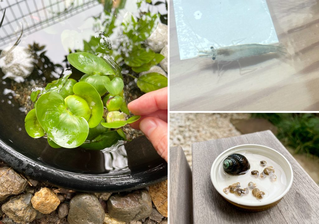 飼育後1ヶ月ほどでメダカとタニシが出産し、昨年末出産した私としては同じ母という親近感が芽生えたり(笑)、エビやホテイソウ、近くの池で捕まえたオタマジャクシも数匹仲間に加わり、いっそうにぎやかなビオトープになっています。