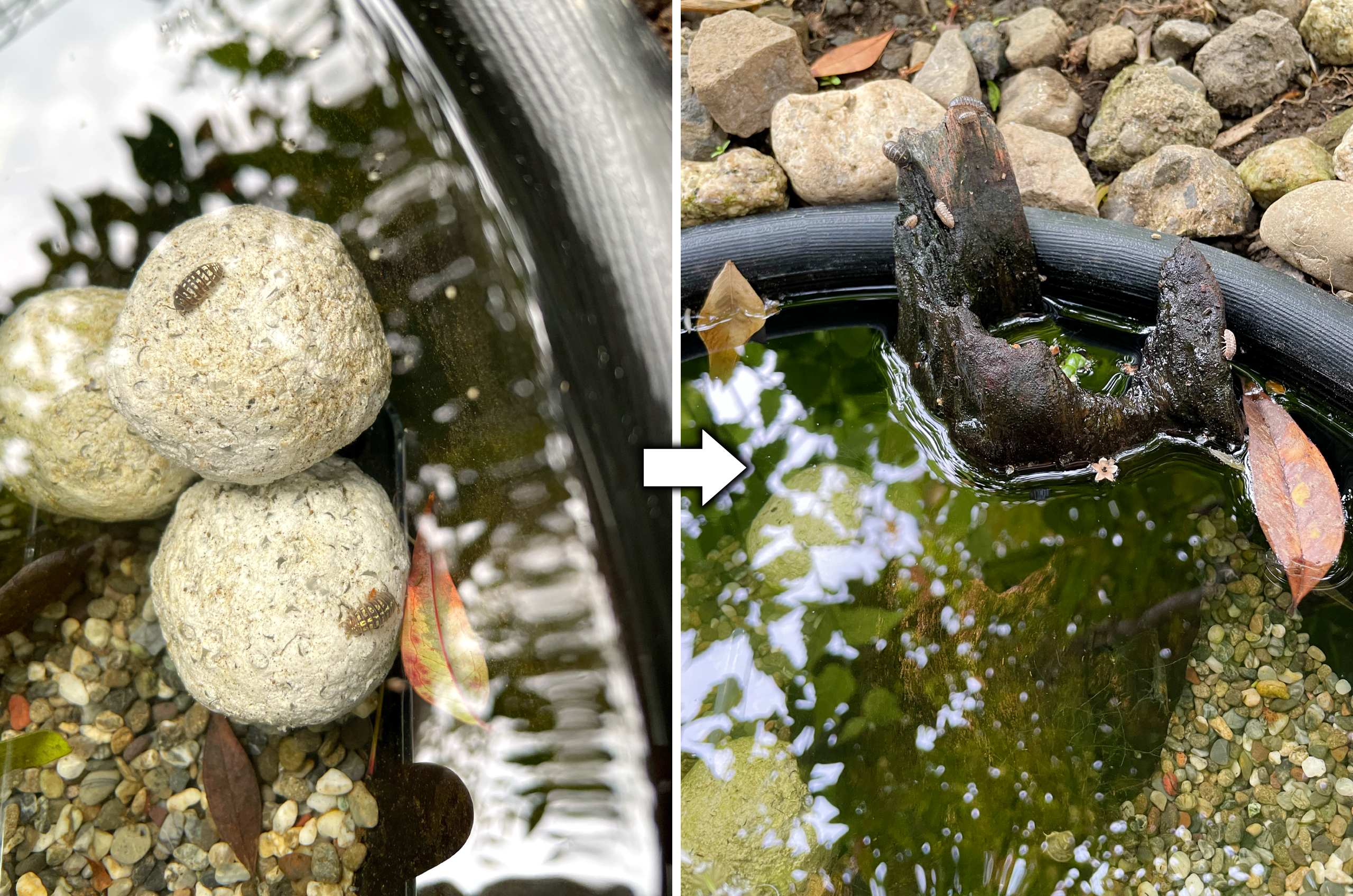 水没しているダンゴムシを観察すると、ほとんどの個体が水中のできるだけ高い場所(石や流木など)に登ったものの逃げ道がなくその場で動けなくなっていました。そこで、流木を斜めに立てかけて陸地への逃げ道をつくりました。本当は陸地と水中の中間領域的な浅瀬をつくれるのがベストな気がしますが、小さな水鉢では難しいのでいったんこれで様子を見ることに。するとその後、水没するダンゴムシは激減!水の中に落ちても流木を伝って自力で陸地へ脱出しているようです。これで一安心!