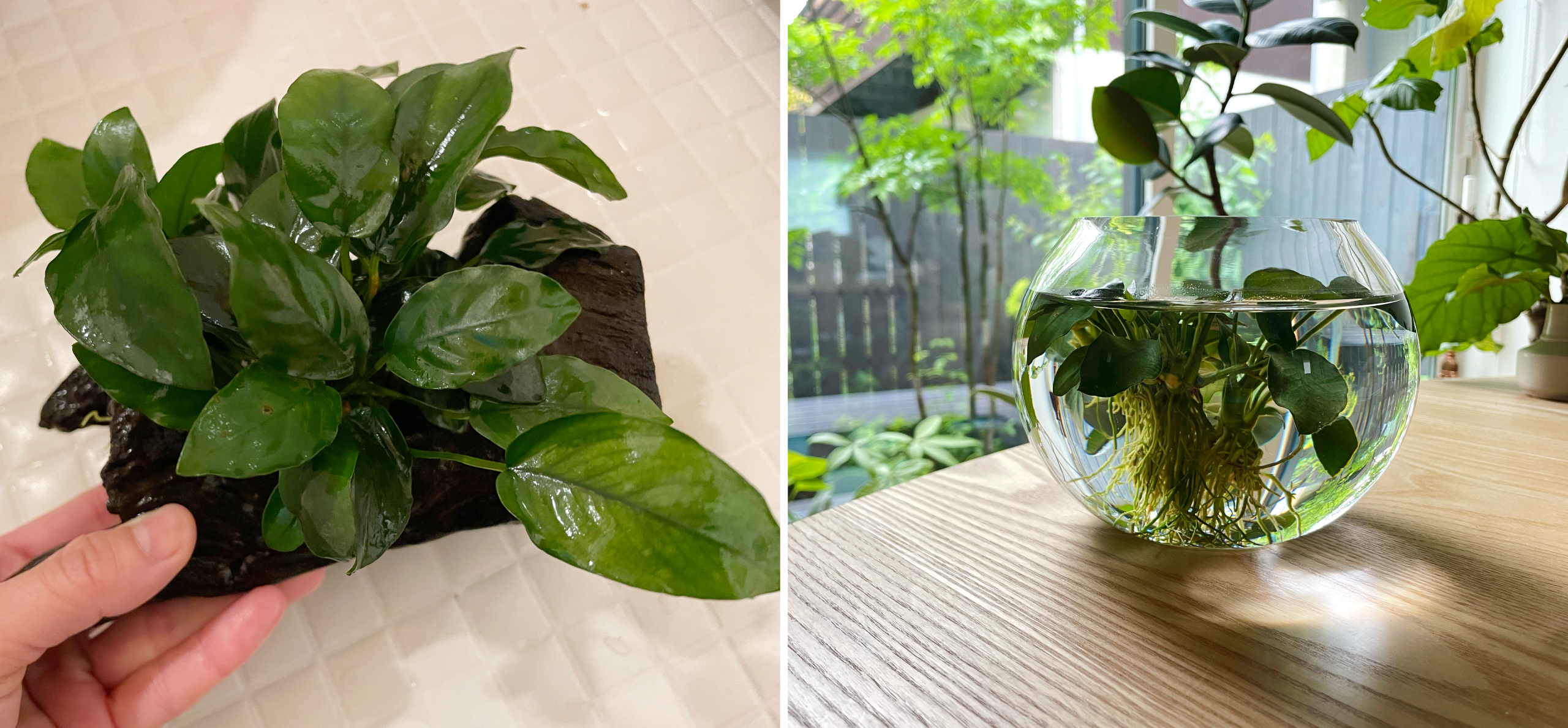何も下調べせずに「見た目が素敵!」と勢いで買った水草「アヌビス・ナナ」。あとから調べてみると、夏場は水温が高いと葉が溶けることがあったり、水の流れがないと茎の間に汚れが溜まって腐ってしまうとのこと。