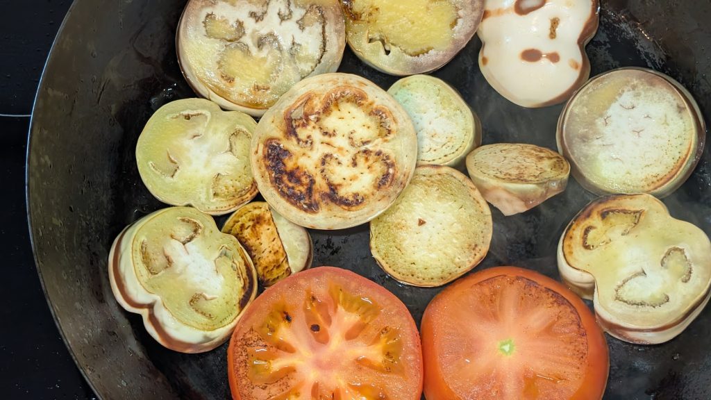近所の方からお裾分けしていただいた野菜と一緒に、早速キッチンで料理します。