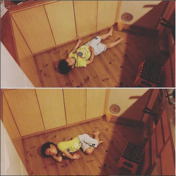 帰って来たらキッチンで寝ててビビった!なんでこうなる!?気持ちイイんかな笑