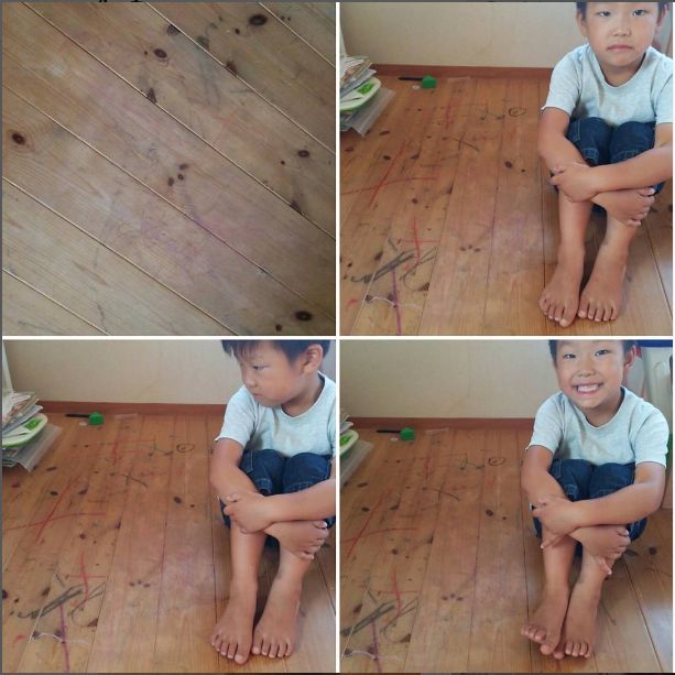 クレヨン。無水エタノールでなんとか落とし(左上)怒られて、もういいから笑え!って言われて(右下)