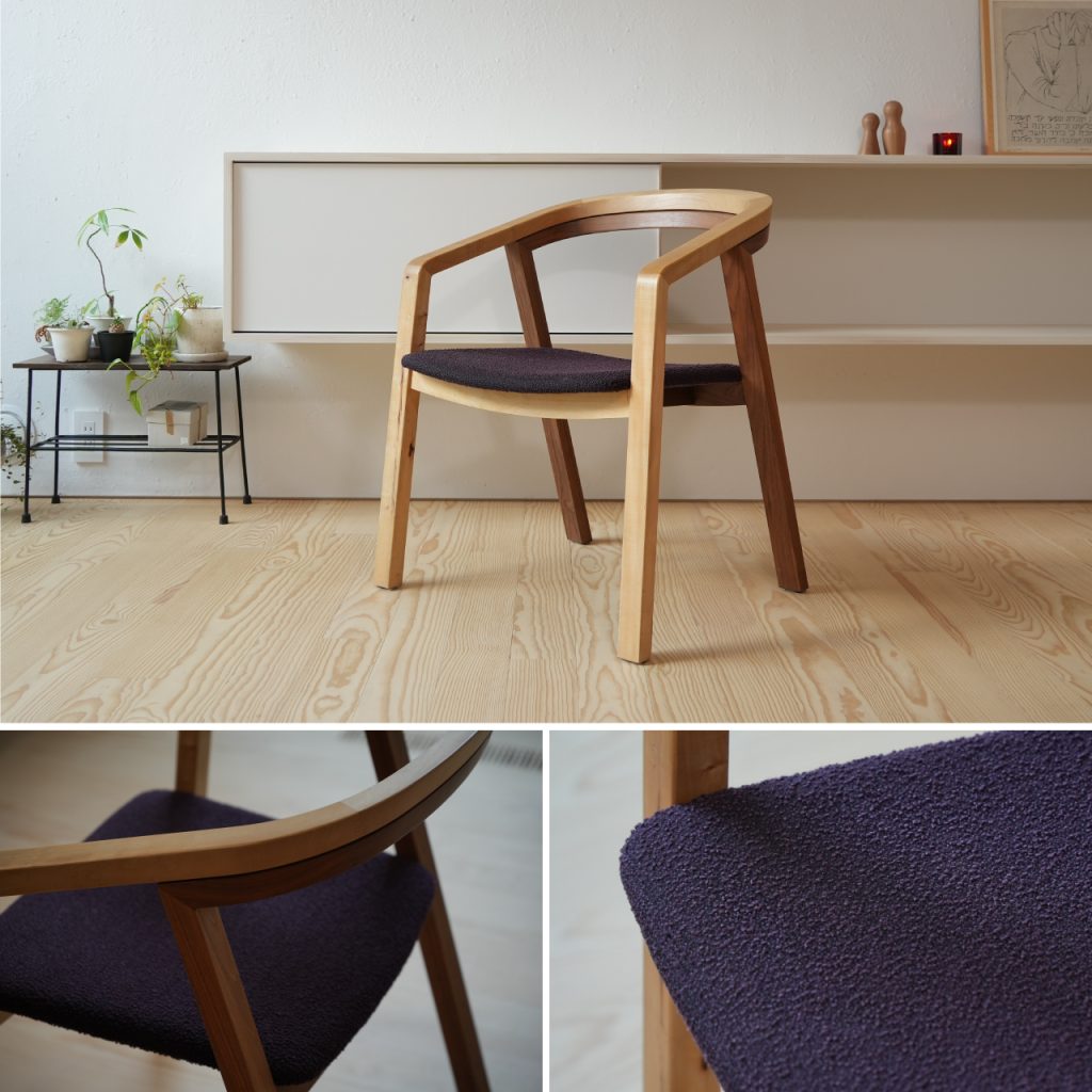 樹種はウォールナットとナラ材が使われていて、樹種の色味の違いや座面も紫色で、見た目にも楽しい一脚。