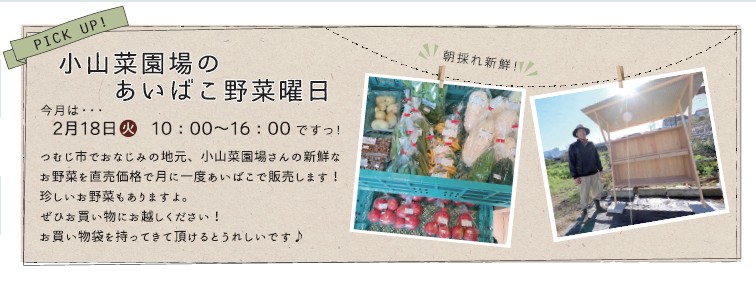 毎月第一土曜日「つむじ市」に出展してくださっている小山農園さんのお野菜をあいばこでも販売します。