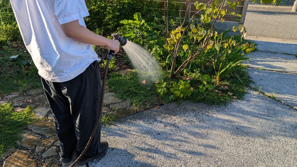 お外の水やりはホースの出番です。
