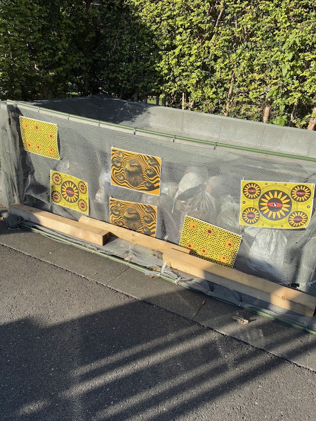 宮崎県日向市の環境政策課の奥原さんが、カラスよけグッズを参考にデザインした”表示板”をネットに取り付けた所、