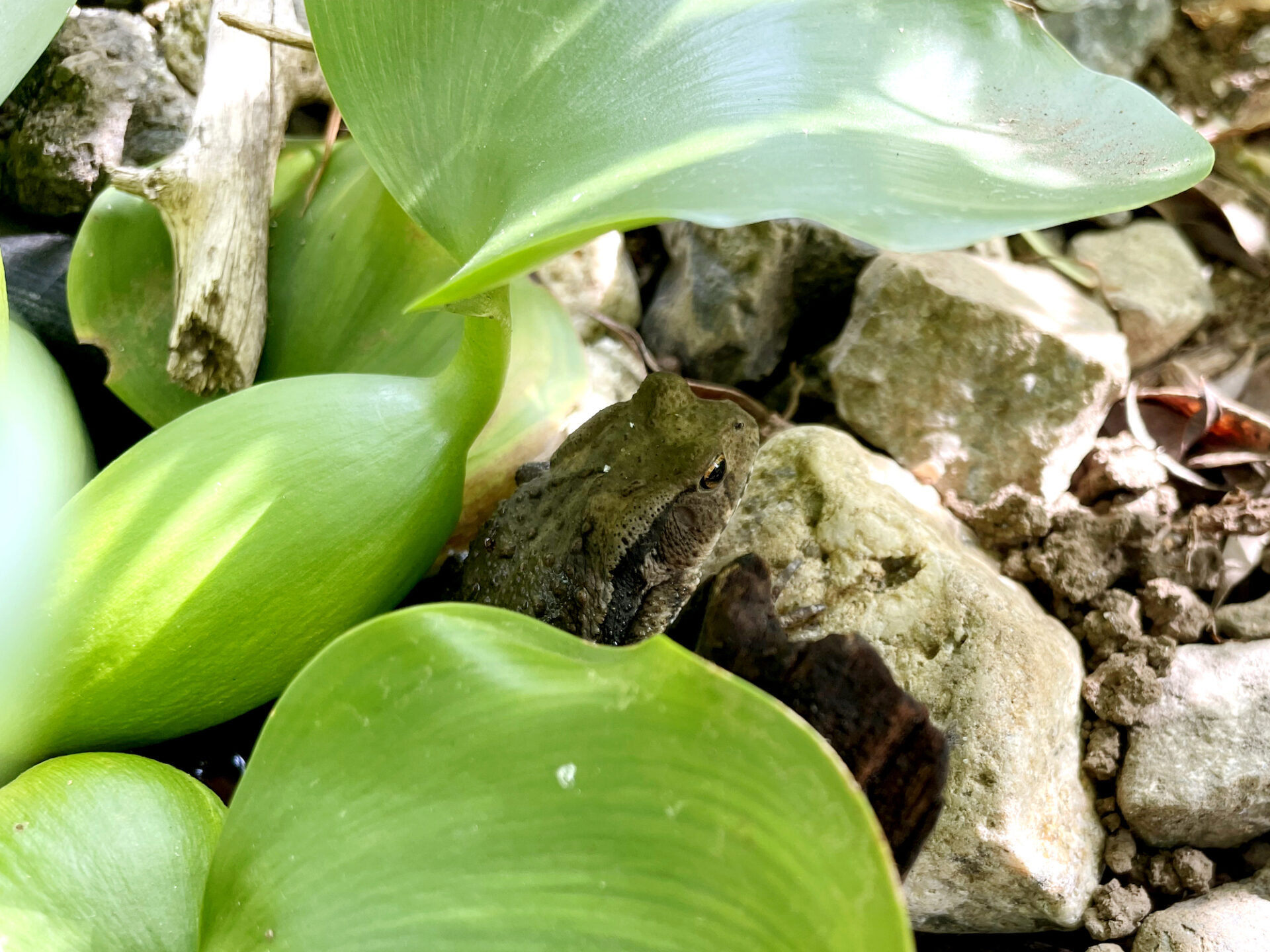 よく見るとヒキガエルが水の中から顔だけ出していました。暑さを凌ぎにやってきたようです。