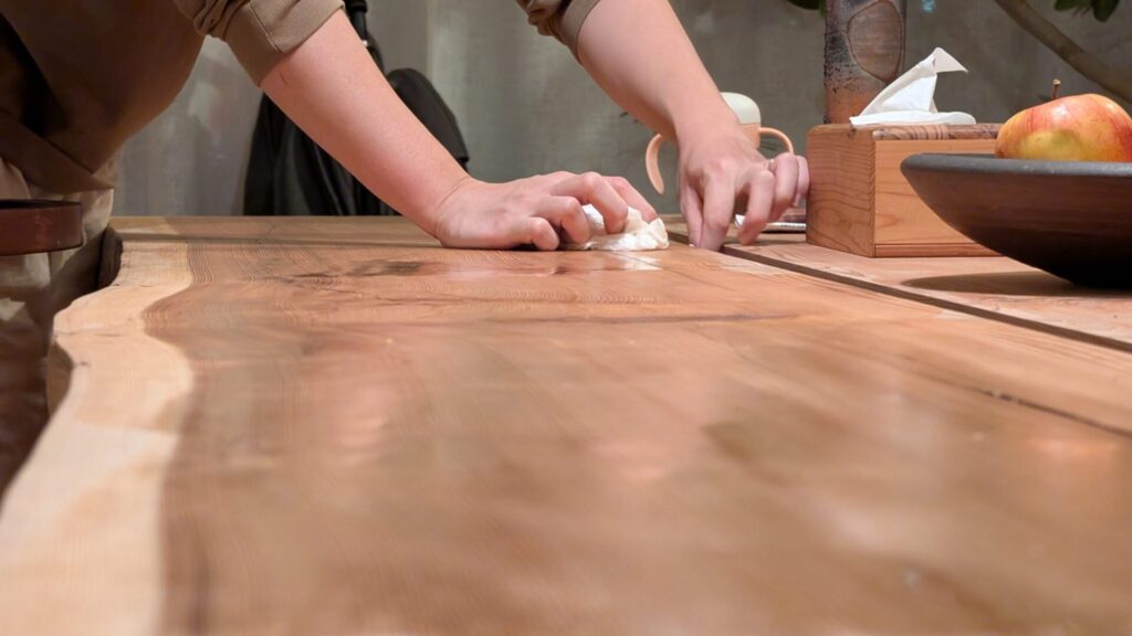 室内では、ある晩お米を研ぎながら「米のとぎ汁って床にいいよね・・・。」と、思い付きでテーブルやら床を磨き始めました。