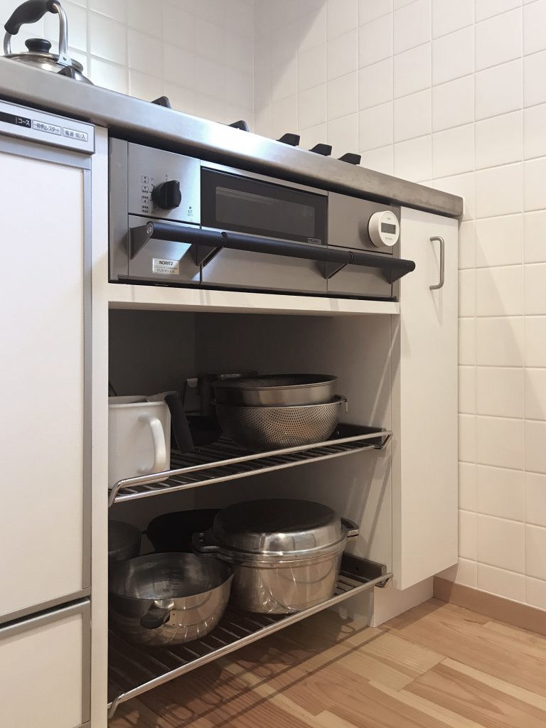 自宅のキッチンではコンロの下にワイヤー製のスライド棚を設けています。