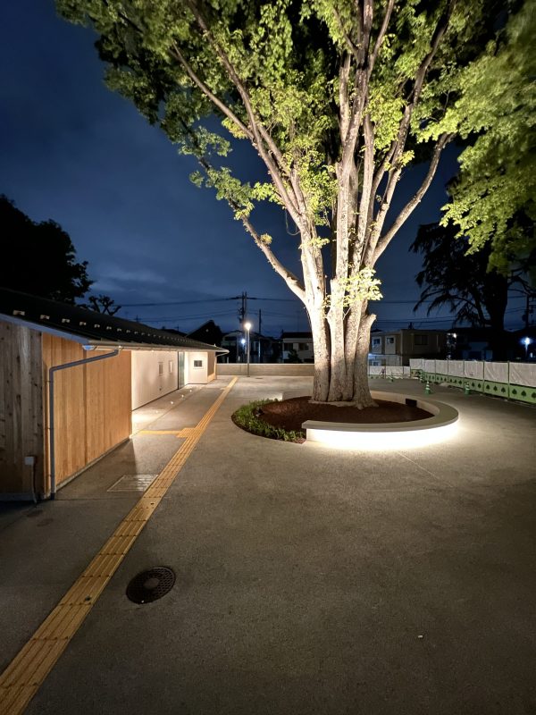 夜になるとシンボルツリーのケヤキの周りがライトアップ!