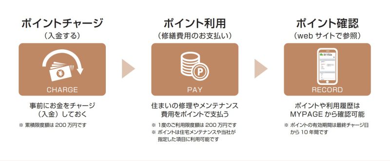 ①あいばの不動産で物件を仲介・契約し、建築工事(新築、リノベ)ご契約のお客様に物件購入価格の1%をチャージポイントで還元。