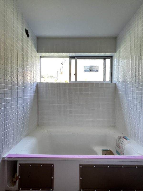 こちらは白のタイルで仕上げる浴室です。高窓なのでちょっと窓を開けたままの入浴も可能。