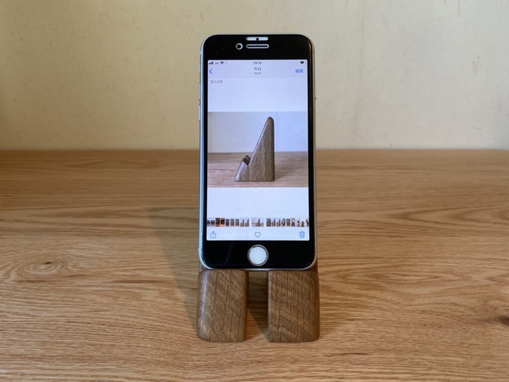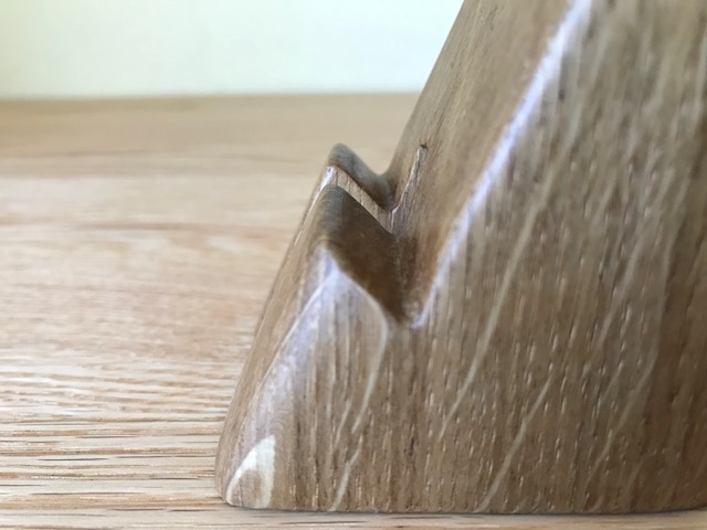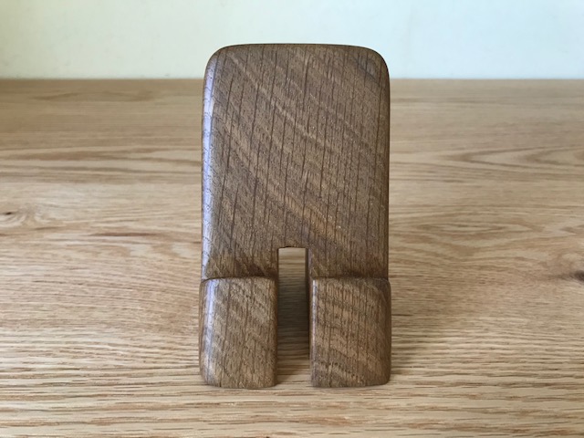 2022.01.20 木造施設コラム 愛用のスマホスタンド 自宅用と仕事用で2つ持っています。写真は自宅用。オイルを塗り重ねたりとメンテナンスしながら一年半程使っています。 お気に入りのフォルム。初めてこの形を見たとき小泉誠さんのデザイン力に感動しました。 正面。下のスリットは充電配線用 台の角度はスマホがより安定するように検討している 素材はナラの無垢材。風合いも少しずつ良くなってきました。愛着ある生活道具です。 デザイン監修 小泉誠 製作・加工 秋山大工・益子大工 仕上:自力 原案:荻野照明 木造施設コラム 一覧に戻る