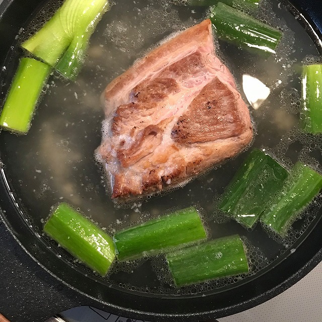 ・長ネギの青いところ、ニンニク、ショウガ(チューブでもOK、7㎝くらい)、酒(大さじ3)、水(1リットル)を入れる。