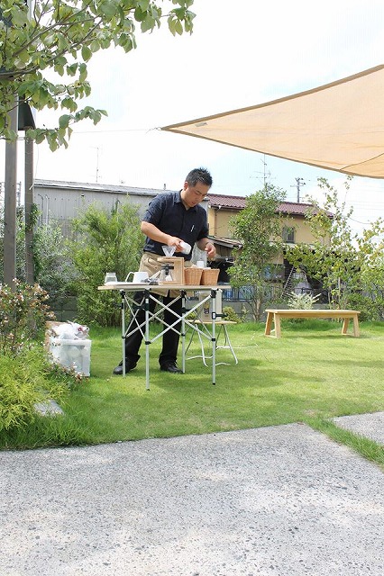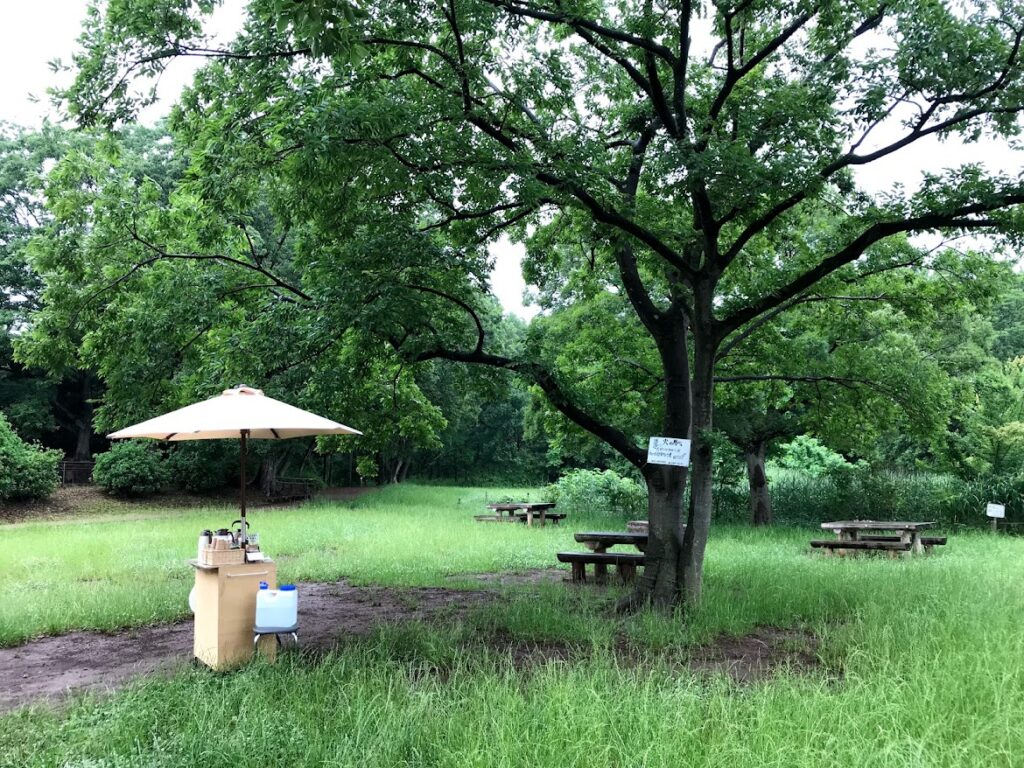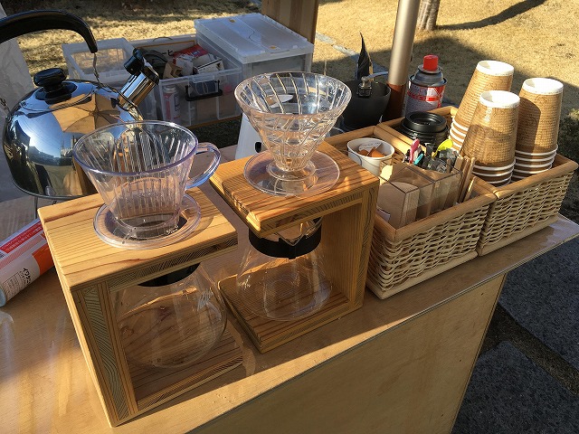 キャンプ用のテーブルに道具を並べて、この時は味もまだまだ安定せず(そりゃそうだ)フリードリンクとして提供していました。