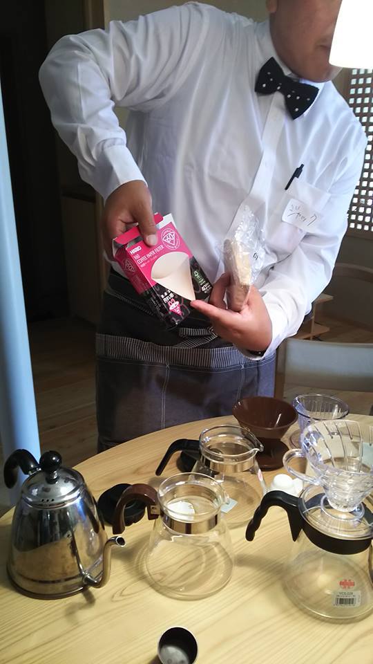 それっぽい格好からといきなり蝶ネクタイを締めて、コーヒーの淹れ方ワークショップを開催!笑