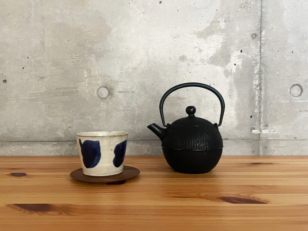 南部鉄器の急須と、沖縄に行った時に購入した新入りの湯呑み(そばちょこ)、こいずみ道具店のコースターが、私のお茶ライフ的三種の神器です。伝統的な手毬型の急須は、0.5リットルの容量で紅茶や中国茶を入れるのにも良いサイズ感。中がコーティングされているので鉄分は取れませんが、陶磁器の急須よりも保温性があるのが特徴です。
