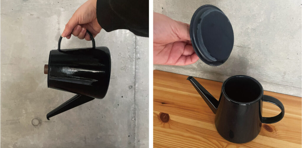 お湯を沸かすのは、小泉誠さんデザインの定番kaicoケトル!その中でもいろいろシリーズの『群青』というカラーを使っています。一見黒に見えますが、濃紺でネーミングに惹かれて購入しました。使い始めて数年ですが、今となっては生活に欠かせない道具。このケトルだけで1つのブログが書けるくらい魅力あふれる製品ですが、私が特に気に入っている点を2つ。1つは90度倒しても蓋が取れないこと!最後までしっかりお湯を注げます。もう一つは蓋の裏にネジが無く、錆びないこと!kaicoケトルを持っている方はそっと試していただきたいのですが、木の取っ手を回すと内側がスクリュー構造になっており、ネジ無しで蓋に付属しています。